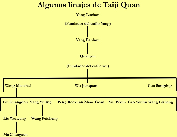 En la historia del Taiji Quan una de las figuras más destacadas fué el maestro Yang Luchan (1799 – 1872), fundador del estilo Yang. Cuando era joven, viajó tres veces al pueblo de Chen Jiagou para estudiar con el maestro Chen Changxing. Después de 18 años de duro entrenamiento pudo desarrollar su arte de manera extraordinaria. Cuando tenía 40 años fue recomendado para que enseñara en Beijing a la guardia imperial. Por su asombrosa técnica ganó el apodo de El Yang invencible. El maestro Yang Luchan contribuyó inmensamente al desarrollo del Taiji Quan en China por entrenar a bastantes discípulos muy importantes, muchos de los cuales fundaron su propio estilo.